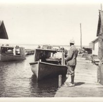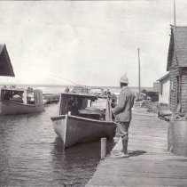 Photo. Fishtown with fishtug Dorothy and Lucille. Dorothy owned by H. Steffens. Lucille owned by Roy Buckler. (Possibly Dr. James Bruce from Kentucky with fish pole). Copy Negative. 94.15.02.01 Print