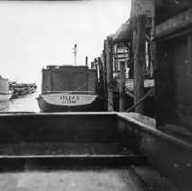 The stern of the fishtug "Helen S." in the Leland River in Fishtown. The fishtug "Diamond" is also visible on the other side of the river. The photo was taken from another fishtug. "Helen S." was owned by Henry Steffens, and "Diamond" was owned by the Carlson family.